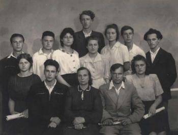 Students of the Taras Shevchenko State Art School. Among those present on the photo are: Vilen Barskyi (top), Ada Rybachuk (second row, center), Oleksandr Dubovyk (first row, left). 1949