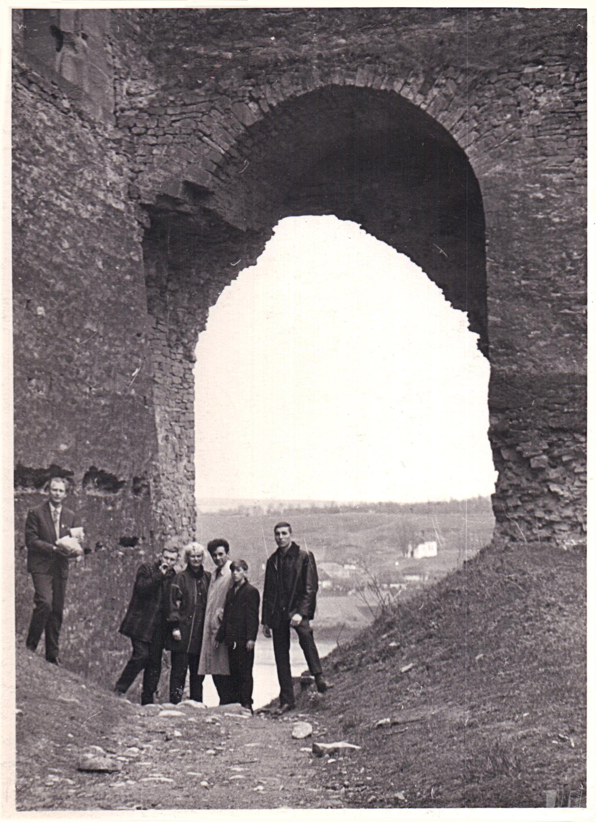 Traveling across Ukraine. From left to right: Erast Binyashevskyi, Vadym Smohytel, Alla Horska, Yevhen Sverstiuk, (?), Yurko Milko. Kremenets, 1963