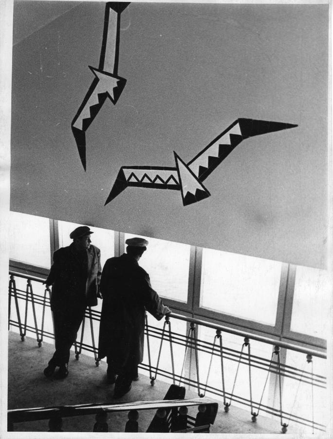 Ernest Kotkov and Valerii Lamakh near the composition “Seagulls over the water” in the vestibule of the Kyiv River Port. [1959–1961]
