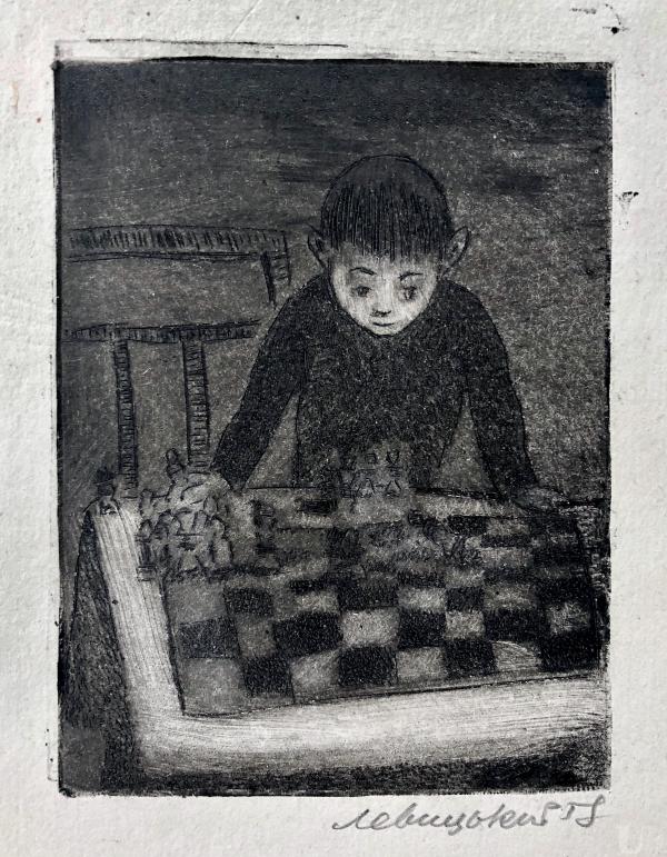 1960sFrom the beginning of the 1960s, Levytskyi returns to formal problematique: creates a series of color monotypes of abstract and figurative character (“Composition,” “Self-Portrait”). Working fruitfully in the field of printing, he crystallizes his own graphic style, based on the archetypes of folk primitive and avant-garde stylization (“In the Barbershop,” “Musicians,” “Woman,” “Motorcyclist”). Thus, the special features of the author’s handwriting are the formative dynamic line that changes its thickness around objects, and the ability to stylize and simplify the form to naive simplicity, witty grotesque (“Nude,” “Woman with a Child,” “Nude with a Jar”). He also wrote a number of picturesque portraits in the author’s style of “vibrating planes” (“Portrait of Wife,” “Family Portrait”).