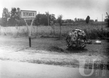Biotechnosphere — the entrance sign to the Peremoha village in the Kyiv region. 1984