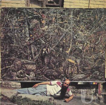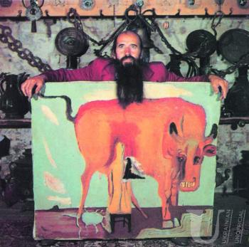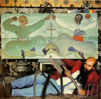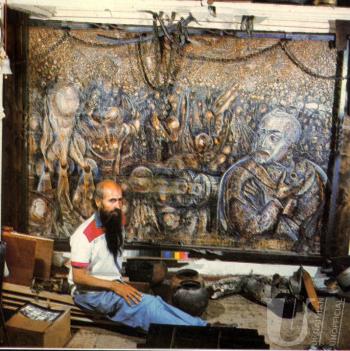 Fedir Tetianych with his own painting “Witch Milking a Cow”. Kyiv. 1980s