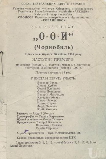 Playbill of the performance “O-O-Y” (“Chornobyl”). 1990