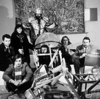 With the actors of the performance “O-O-Y” (“Chornobyl”). In the center is Oleksandr Dirdovskyi, behind is Fedir Tetianych, on the right is Andrii Zholdak. [1990]