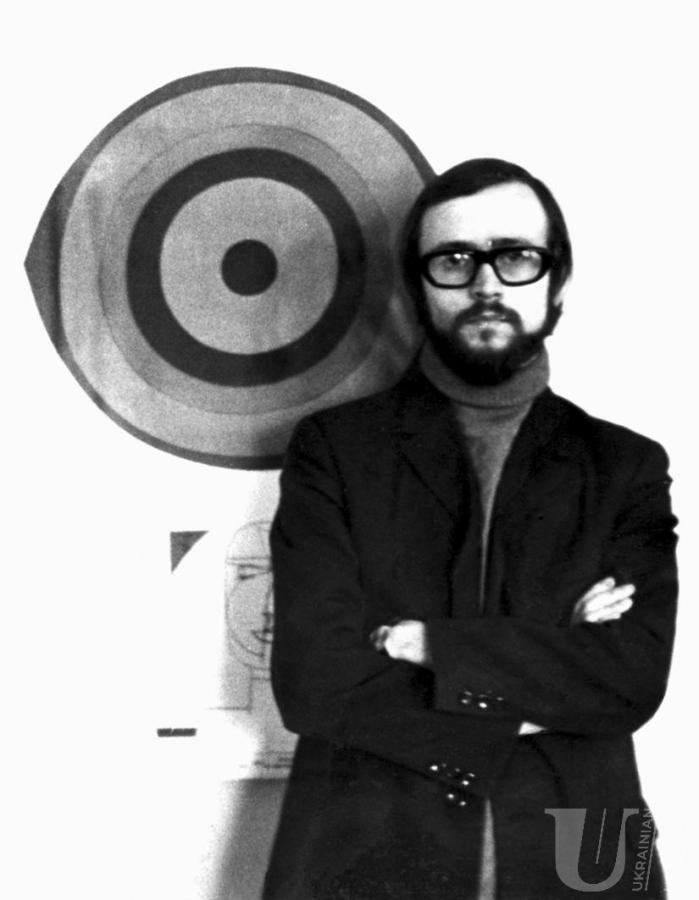 Олександр Аксінін на тлі роботи Еві Тихеметс-Вийрес «Попередження» на виставці у Художньому музеї ЕРСР. Таллінн, 1972. Автор фото Катерина Суєвалова