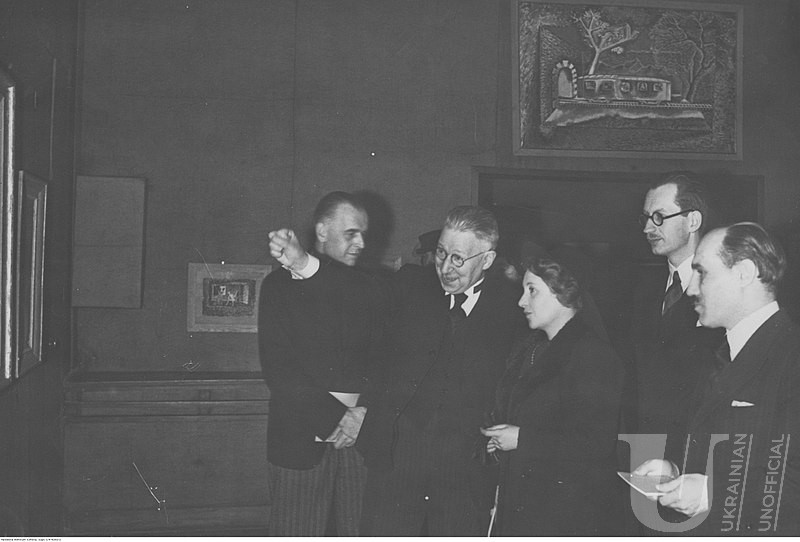 Войцех Свентославський (другий ліворуч) у супроводі художниці Марґіт Сельської відвідує художню виставку. Варшава, 1939. Джерело: audiovis.nac.gov.pl